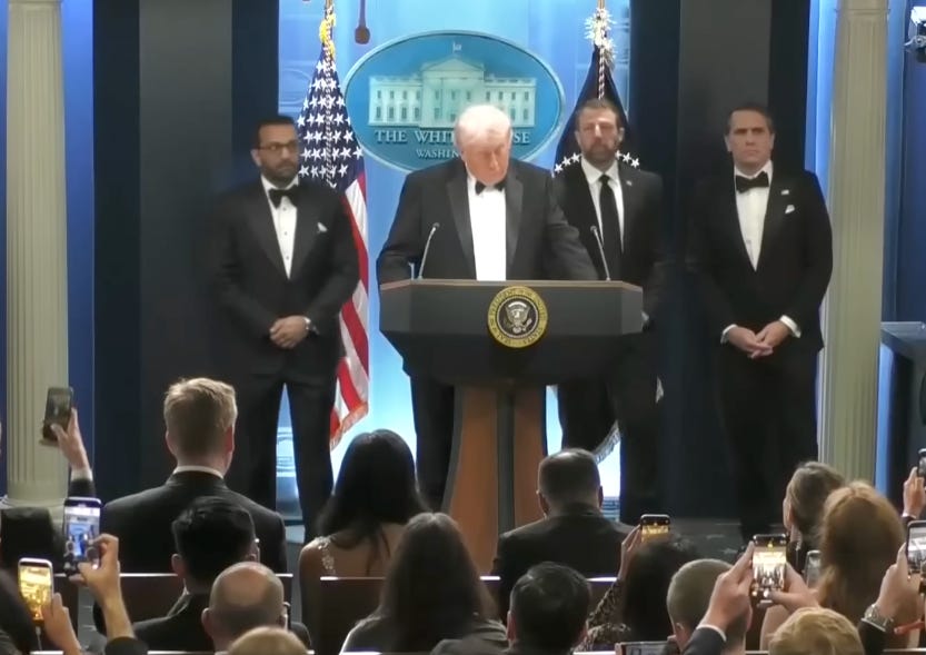 The structure is this. A would-be assassin, motivated by what appears to have been grievance against the most authoritarian American administration in living memory, attempts to kill that administration’s officials at a press dinner. The substance of the moment — the actual content of what just happened — is the second assassination attempt within eighteen months on figures associated with the Trump project, in a political climate the Trump project itself has produced through a decade of explicit incitement against its enemies. The frame the moment demands, if the frame is to track reality, is the frame that names the relationship between the climate and the act. The climate was produced by a specific coalition. The act is downstream of the climate. The carriers of the climate include nearly everyone seated in that ballroom on the right side of the aisle, including Trump himself, who has been producing eliminationist rhetoric against his political opponents at industrial scale and would, given the chance, produce more of it before breakfast tomorrow.