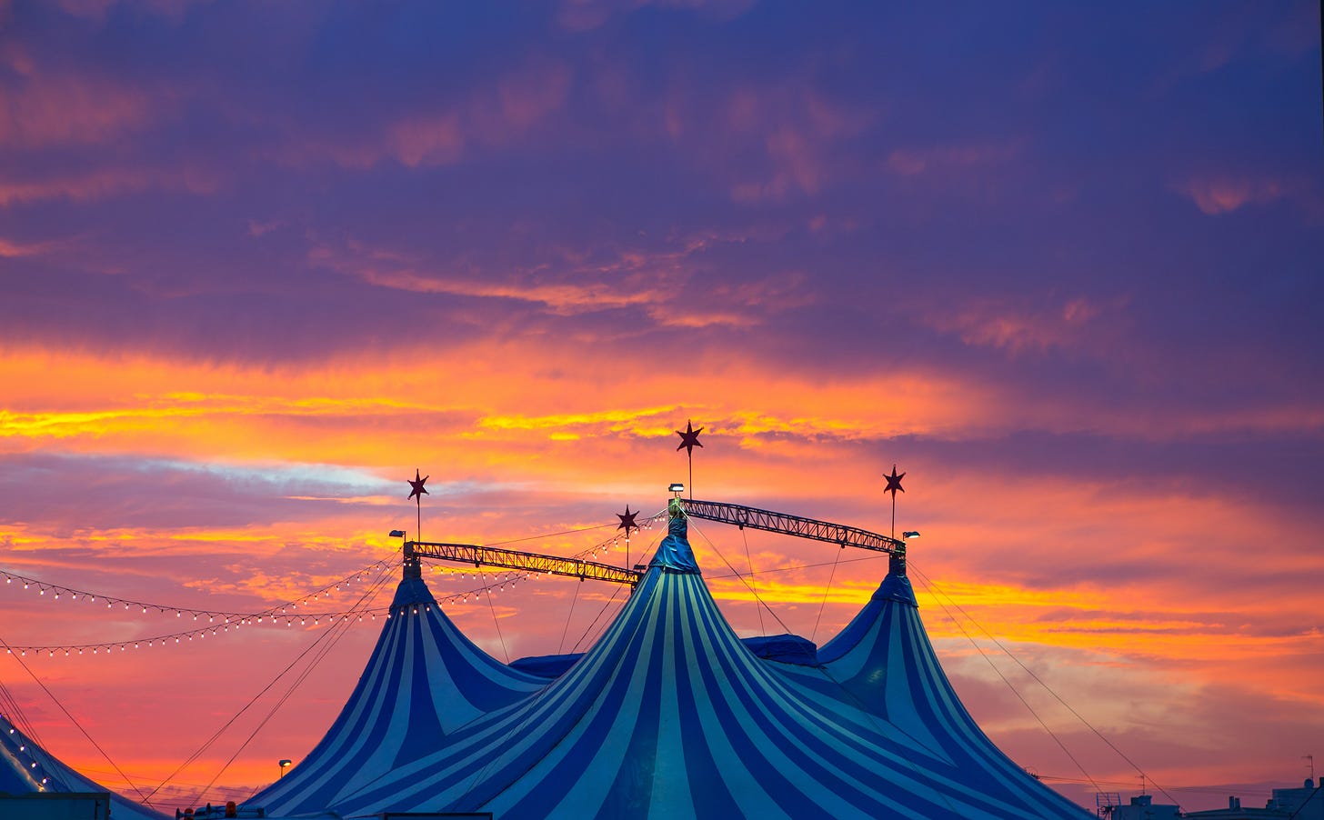 The sun is rising. The people will be here soon. The clowns are putting on their clown makeup.
